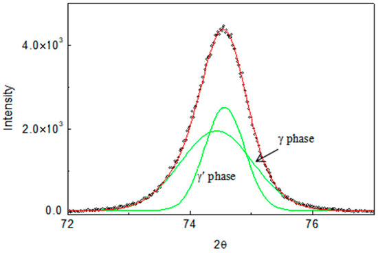 Figure 2 presents the X-ray diffraction (XRD) patterns of the alloy in the fully heat-treated condition. The peak separation of the γ/γ′ two phases at specific diffraction angles was performed using Origin 8.5 software. After the deconvolution of the composite diffraction peaks, the individual peaks corresponding to the γ and γ′ phases were extracted and positioned beneath the overall synthetic peak. The lattice constants of the γ and γ′ phases were calculated to be 0.3615 nm and 0.3600 nm, respectively, resulting in a lattice misfit of −0.3254%. Compared to alloys that do not contain Re or Ru, the lattice constant of the γ matrix phase in this alloy is relatively large. This is attributed to the enrichment of Re and Ru—both possessing large atomic radii—in the γ matrix phase [24].