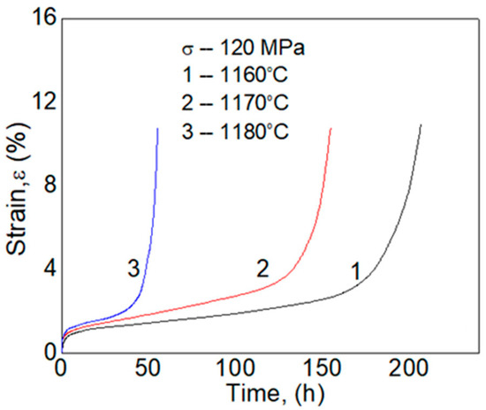 The steady-state creep strain rates of the alloy at 120 MPa and temperatures of 1160 °C, 1170 °C, and 1180 °C gradually increase with temperature, measured as 0.0083%/h, 0.0176%/h, and 0.0219%/h, respectively. Correspondingly, the creep lifetimes are 206 h, 155 h, and 55 h. These results indicate a significant decrease in creep life when the temperature exceeds 1170 °C, suggesting that 1170 °C represents a critical threshold beyond which the mechanical properties of the alloy rapidly deteriorate.