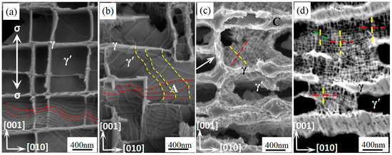 Figure 4 illustrates the formation process of the dislocation network at 1160 °C/120 MPa. Figure 4a shows the dislocation morphology within the γ matrix after 2 h of creep. At this stage, the γ′ phase remains cubic and has not yet evolved into a raft-like structure. A large number of <110>-type 60° mixed dislocations are observed in the vertical matrix channels, as indicated by the segments marked by the red lines. These dislocations are believed to originate from (111) edge dislocations through slip sweeping, a mechanism to be further analyzed in Section 4.1. Figure 4b presents the dislocation morphology after 2.5 h of creep at the same temperature and stress. The γ′ phase remains cubic, with no significant morphological changes. Meanwhile, <110>-type 60° mixed dislocations also appear in the horizontal γ matrix channels, marked by the segments indicated by the yellow lines. It is suggested that, in alloys with negative lattice mismatch under tensile stress, the vertical matrix channel experiences higher stress than the horizontal one, causing vertical dislocations to form earlier. When 60° mixed dislocations from both channels intersect, a dislocation mesh begins to form, as seen in region A of Figure 4b. At this stage, the mesh has a relatively large spacing, and although the dislocation network is initiated, the γ′ phase has not yet formed a raft-like structure. This suggests that the dislocation network at the γ/γ′ interface forms before the rafted γ′ phase.