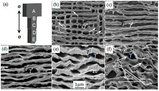 The microstructural morphology of region A is shown in Figure 5b. Due to the relatively low stress in this region, the γ′ phase does not form a complete raft structure, and γ matrix channels remain parallel to the stress axis, as indicated by the arrow. The microstructures of sample areas B and C are shown in Figure 5c and Figure 5d, respectively. It can be observed that the γ′ phase has transformed into a raft structure, with its size remaining relatively unchanged at approximately 0.4 μm. The raft-like γ′ phase retains a relatively straight morphology, although the distortion of the γ′ phase in Figure 5d is slightly greater than that in Figure 5c. The γ/γ′ two-phase morphology in Figure 5d is more similar to that shown in Figure 4d. The microstructure of region D is shown in Figure 5e. In this region, the raft-like γ′ phase has undergone coarsening, with its size increasing to approximately 0.6 μm. The raft-like γ′ phase also exhibits a twisted morphology, with an angle of approximately 20° relative to the horizontal direction. The microstructure of region E is shown in Figure 5f, where the degree of coarsening and twisting in the rafted γ′ phase is significantly increased. Its thickness has grown to 0.7 μm, and the angle has increased to about 40°. Furthermore, part of the γ′ phase has transformed to have a large morphology, as indicated by the arrows in Figure 5f.
