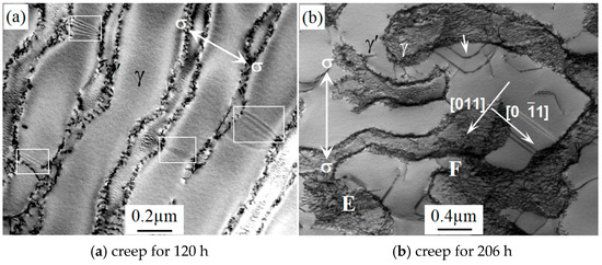 The generation and movement of dislocations are crucial for the plastic deformation of the alloy and the ultimate creep fracture. An interfacial dislocation network forms when dislocations from different slip systems meet at the γ/γ′ two-phase interface. This dislocation network can impede the motion of dislocations within the γ matrix and suppress the emission of dislocations from their sources. As a result, the dislocation network significantly contributes to the creep resistance of the alloy. It is important to note that the dislocation network is not static, as it transforms into creep. Different morphologies and densities of the dislocation network influence dislocation behavior in various ways, affecting the alloy’s creep properties accordingly [28,29].
