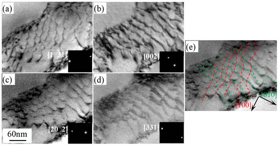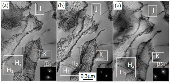 It can be seen that the dislocation J displays contrast at g-vectors of [31] (Figure 8a) and [022] (Figure 8b), while it does not show contrast at a g-vector of [331] (Figure 8c). According to the invisible criterion g·b = 0 dislocations, it is determined that the Burgers vector of J is bJ = (1/2) [10]. Since the line vectors of the dislocation J are μJ = [110], the slipping planes of the dislocation J are J × μJ = (100). Dislocations K, H1, and H2 display contrast at a g vector of [331] (Figure 8c), while dislocations K, H1, and H2 do not show contrast and display contrast at a g vector of [022] (Figure 8b), respectively. While dislocations K, H1, and H2 display contrast and do not show contrast at a g vector of [31] (Figure 8a), respectively. As such, we determined that the Burgers vector of k and dislocation H1 and H2 are bK = (1/2) [01] and bH = (1/2) [101], respectively. Since the line vectors of dislocations K and H1 and H2 are μK = [011] and μH = [211], respectively, the lipping planes of dislocation K is the bK × μK = (100) plane, and the slipping plane of dislocation H is the bH × μH = (11) plane.