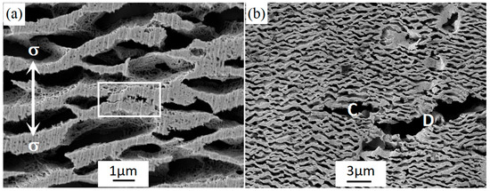 As creep continues, more cracks initiate, and the alloy undergoes more pronounced necking. The effective stress increases steadily. When the angle of the crack tip reaches a critical value, the crack expands along the direction of maximum shear stress, forming larger cracks. The larger cracks observed after the creep fracture at 1160 °C/120 MPa are shown in Figure 9b. These cracks expand perpendicular to the stress axis under maximum shear stress and eventually connect (as labeled C and D in the figure). The formation of large cracks and their eventual coalescence lead to the creep fracture of the alloy, marking the final failure process during creep.