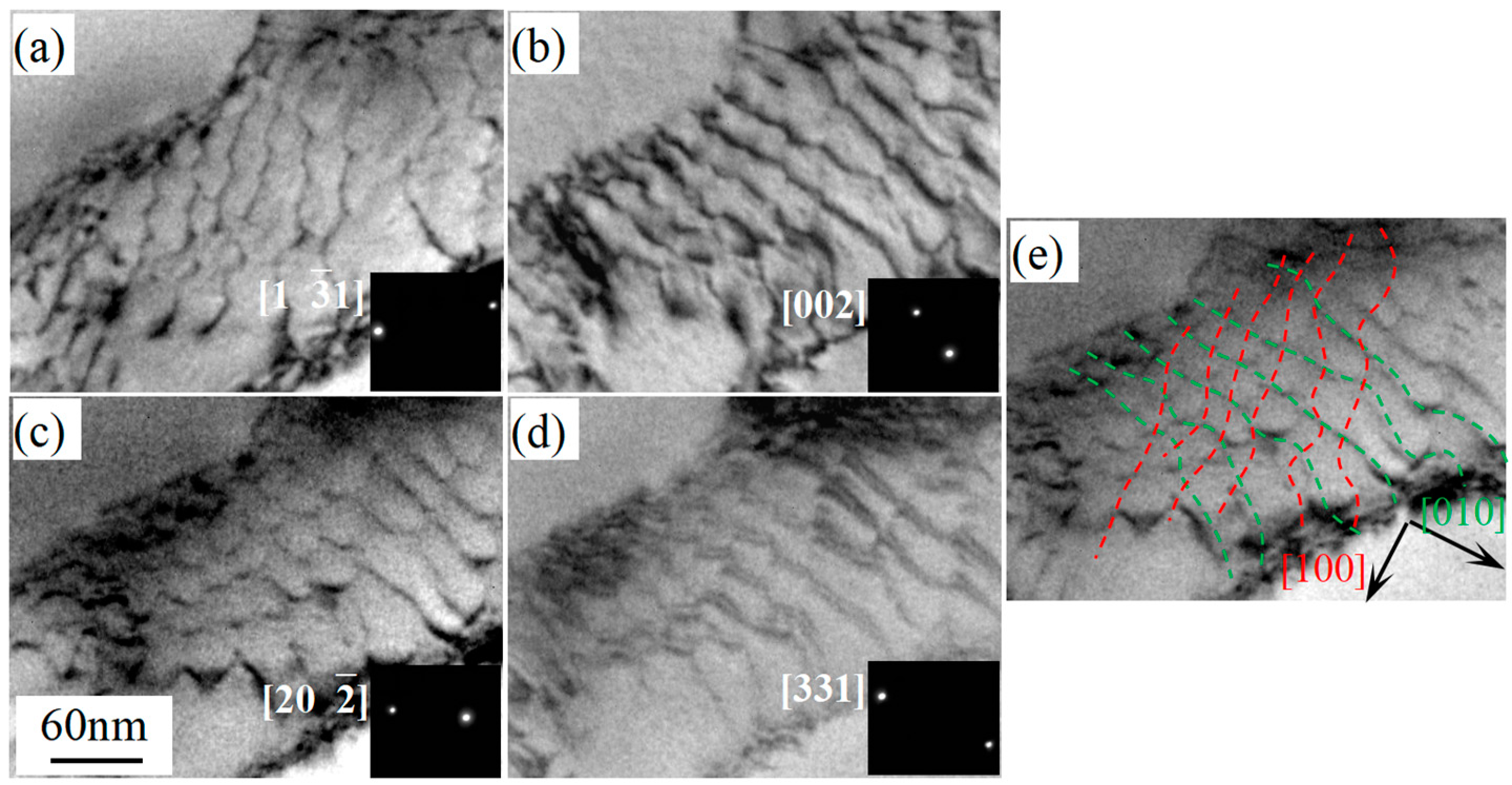 Dislocation network at different g-vectors after fracture at 1160 °C/120 MPa following creep for 206 h. (a) g = [11], (b) g = [002], (c,e) g = [20], (d) g = [331].