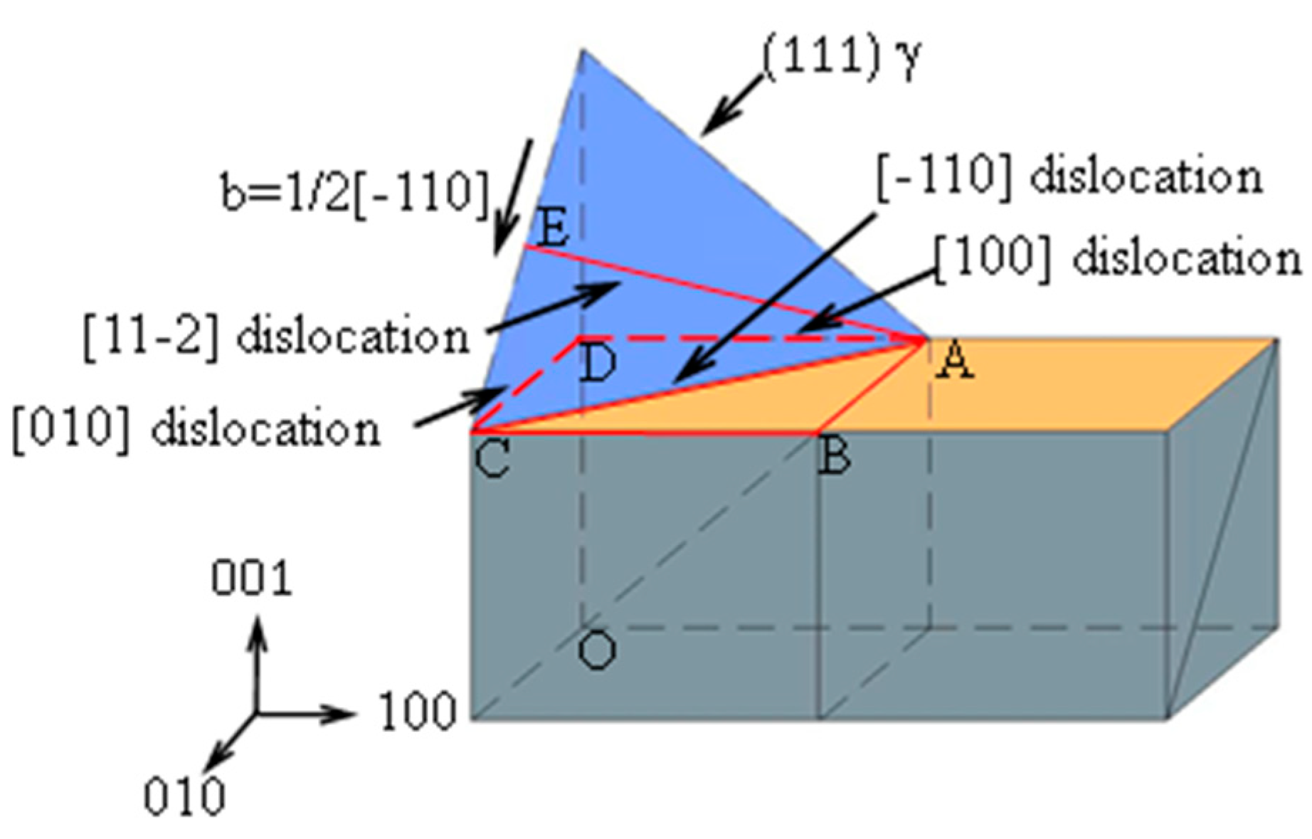 The alloy generates mismatch dislocations under mismatch stress conditions during creep, which in turn forms a dislocation network. In this process the stress field due to the mismatch stress at the interface of the γ′/γ two phases is positive; therefore, only edge dislocations that also generate positive stresses can reduce the mismatch stress [30]. As an example, an edge dislocation with a Burgers vector of b = 1/2[110] and a dislocation line direction of [112] can be plotted with its motion path as shown in Figure 10. The dislocation will slip across the (111) plane of the γ phase until one end of it touches the (100) γ′/γ two-phase interface (position AE). As the slip is impeded, the dislocation moves in a sweeping slip manner in the (111) plane of the γ phase until its other end also hits the (100) γ′/γ two-phase interface (position AC). By sweeping across the plane, the edge dislocation becomes a <110> 60° mixed dislocation, and the edge component changes from to . Although a sweeping slip will cause the edge dislocation component to be reduced, it will, at the same time, cause the edge dislocation to change from a point of contact with the (100) γ′/γ two-phase interface to a 60° mixed dislocation with a line of contact with the (100) γ′/γ two-phase interface, so a 60° mixed dislocation can more effectively reduce the mismatch of the alloy. When a large number of 60° mixed dislocations meet at the (100) γ′/γ two-phase interface, the <110> dislocation network is formed as shown in Figure 4a. After the dislocation sweeps and slides to AC to form a <110>-type 60° mixed dislocation, the <110>-direction AC dislocation can form an AB or AD <100>-direction dislocation around point A, or a CD or CB <100>-direction dislocation around point C, and a <100>-direction dislocation network is formed as shown in Figure 4b,c.