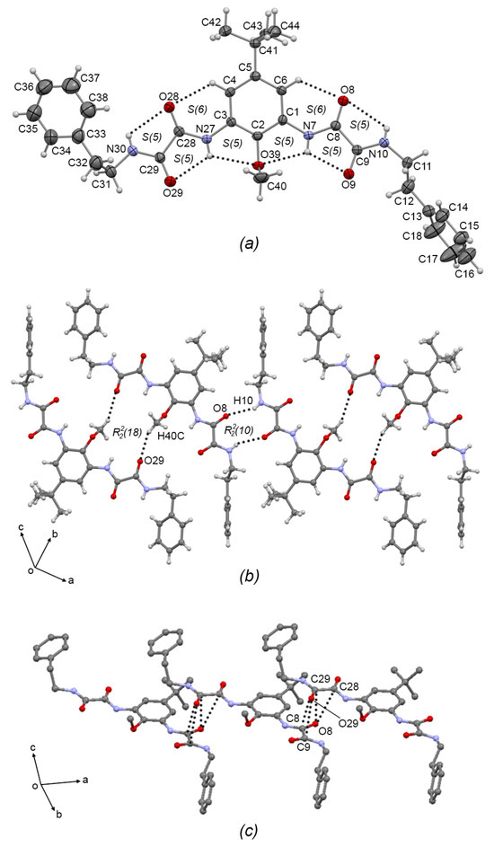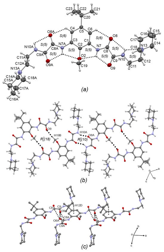 Compound 3a, Figure 3a, crystallized in the monoclinic system with space group C2/c; therefore, only one half of the molecule is observed. The oxalamidic groups adopt the exo–exo conformation with respect to the aromatic ring (torsion angle C2—C1—N7—C8 = −105.1(4)°). The N10—C11—C12—N13 torsion angle of the aminoethylmorpholine fragment is 170.3(3)° adopting an anti conformation. This molecule presents two adjacent sets of intramolecular hydrogen bonds [S(5)S(5)]; geometric intramolecular interactions parameters are listed in Table 3. Moreover, molecules of 3a are self-assembled in 1D via the N7-H7···O9 hydrogen bond (forming the R22(10) motif) and the C14—H14···Cg(2) interaction (Cg(2) = C1/C2/C6/C5/C6/C1), developing a 1D supramolecular meso-helix running along the c-axis, Figure 3b, similar to the related compound N′,N1′-(1,3-(2,4,6-Trimethyl)-phenyl)-bis-(N2-(2-(2-hydroxyethoxy)ethyl)oxalamide) [7]. Geometric intermolecular interaction parameters are listed in Table 4 for compounds 3a–c. The turn of the helix, measured as the space between phenyl rings, is 15.78 Å, which corresponds with the length of the c-axis of the unit cell. Two-dimensional supramolecular arrangement is given by interconnected helixes along the ab plane by the formation of the N10—H10A···N13 hydrogen bond, Figure 3c.