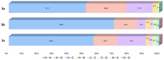 Percentage of contribution of the most significant interactions and their reciprocals in compounds 3a–c. N∙∙∙X (X = C, N, O).