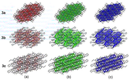The visual representation of the energy-framework diagrams for Eele (red), Edis (green), and Etot (blue) for a cluster of nearest-neighbor molecules is shown in Figure 8. The crystal networks of 3a–c are mainly dominated by the Edis component, showing zig-zagging energy frameworks that overcome the Eelec component to give the final shape to the Etot energy framework in all cases.