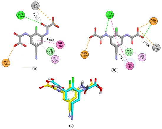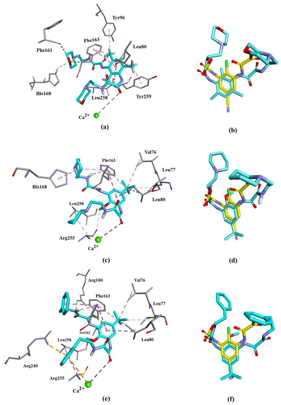 Validation of the method was performed by reproducing the experimental binding of the co-crystallized ligand lodoxamide to the GPR35 receptor. Our protocol replicated the experimental binding mode of lodoxamide with an RMSD of 2.05 Å, showing hydrogen bonding interaction with Arg164, electrostatic interaction with Arg 240, π-π stacking and π-alkyl interactions with Phe163 and Leu80, respectively, and coordination with the catalytic calcium ion, Figure 9. Additionally, the calculated binding mode of lodoxamide exhibited hydrogen bonding and π-π stacking interactions with Leu258.