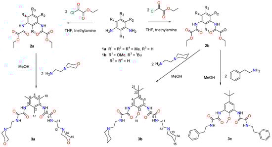 The synthesis of 1,3-phenylene bis-oxamides 3a–c was carried out by reacting the 1,3-phenylene bis-oxalamate 2a or 2b with the corresponding amine, Scheme 1.