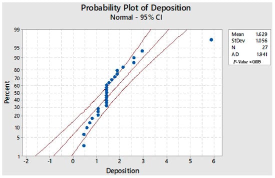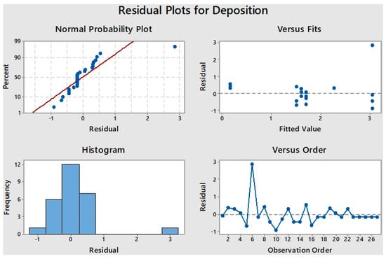 A quadratic model was identified as the best fit for the data. The model was fitted using a stepwise automatic reduction algorithm to eliminate insignificant terms at a 95% significance level. The probability plot for deposition was illustrated in Figure 1, while the residual plots for deposition were depicted in Figure 2. The model demonstrated a significance level of <0.0001. The lack of fit was not statistically significant. The R2 value was 0.76, exceeding the recommended threshold of 0.6. The difference between the Adjusted R2 value and the Predicted R2 value was less than 0.2. The adequate precision value was also found to be sufficient. It was concluded that the model exhibited good performance. The residual versus fitted values plot displayed homoscedasticity, confirming that the assumptions of the linear model were satisfied.