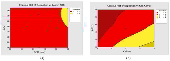 Figure 3. Deposition interactions with (a) power and SOD (b) primary gas flow rate and carrier gas flow rate.