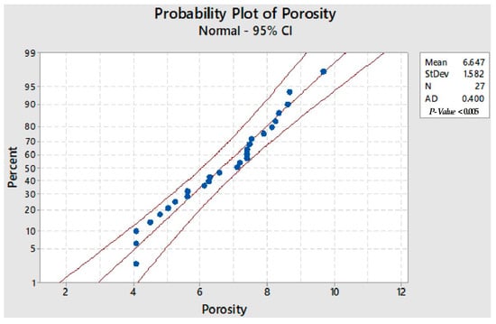 The porosity probability plot and residual plots for porosity are presented in Figure 4, respectively. The 95% confidence interval (CI) was clearly achieved, with the residual plots demonstrating a reduced number of outliers. The model met the criteria for application in this study. The plot of residuals versus fitted values exhibited homoscedasticity, confirming that the assumptions of the linear model were satisfied, consistent with the observations for deposition efficiency.