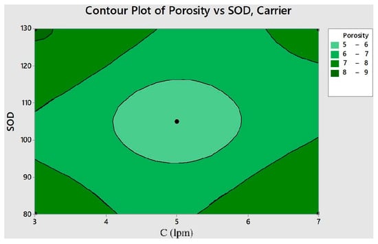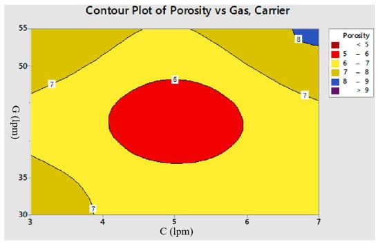 The porosity regression equation, as shown in Equation (4), indicated that Power (P), Primary Gas (G), stand-off Distance (SOD), and Carrier Gas (C) had a significant influence on porosity. Porosity exhibited an increase with higher levels of Power, Primary Gas flow rate, and Carrier Gas flow rate, while it decreased with an increase in stand-off Distance. The equation also identified significant interactions between Power and stand-off Distance, Power and Primary Gas flow rate, Power and Carrier Gas flow rate, Primary Gas and stand-off Distance, Primary Gas and Carrier Gas, and stand-off Distance and Carrier Gas. These interactions are clearly demonstrated in the contour plots presented in Figure 5.