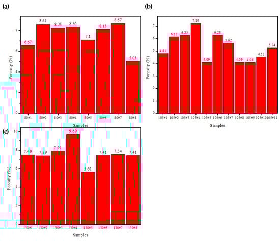 Figure 7. Porosity of plasma-sprayed chromium oxide (Cr2O3) based coatings before optimization grouped in terms of stand-off distances; (a) 80 mm, (b) 105 mm, and (c) 130 mm.
