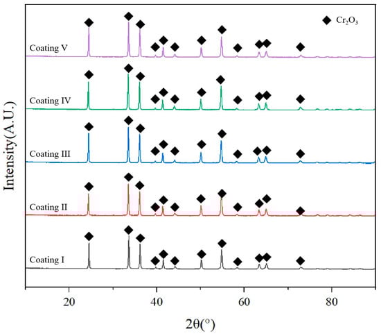All five coating groups exhibited a single Cr2O3 phase composition. Furthermore, no significant alterations in the phase constituents were observed despite variations in the spraying parameters. Simultaneously, the strongest diffraction peak detected in all coatings corresponded to the Cr2O3 (104) plane (observed at 2θ = 33.54°). This finding indicates that the crystalline grains in all five coating groups demonstrate consistent preferred orientation during growth.