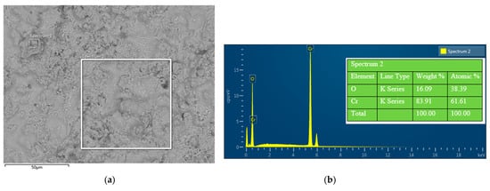 Figure 12. (a) SEM micrograph showing spectrum spot and (b) the EDS spectrum results for optimized chromium oxide coating II.