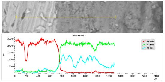 The magnified SEM images of Coating II are given in Figure 11 and Figure 12. Figure 11 presented the EDS mapping results of the optimized chromium oxide for Coating II, which exhibited the highest porosity. The mapping revealed a non-uniform distribution, with numerous patches observed above the green layer. This non-uniformity indicated an uneven coating, accompanied by microstructural flaws, as previously observed in the coating morphology analysis. The aggregation of Cr elements in most regions suggested the presence of increased pores or microcracks on the coating surface. A spectrum spot was analyzed on the surface of the optimized chromium oxide coating from Coating IV (characterized by high porosity), as depicted in Figure 12. The corresponding elemental information table and EDS spectrum analysis are provided. The Cr atom content was measured at 61.61%, while the O atom content was 38.39%. These values suggested uneven packing of coating particles during the deposition process, leading to the formation of pores and unfilled voids due to inadequate flattening upon impact. Figure 13 illustrated the EDS line scan, demonstrating the distribution of Fe, Cr, and O, which exhibited a distinctive bilayer structure composed of large grains and small crystals. This figure corresponded to the optimized chromium oxide coating for Coating V, which had a low porosity level. The scan direction extended from the substrate to the coating. The results indicated a generally uniform distribution of Cr and O across the analyzed area. Fe elements were not detected until the scan reached the substrate/coating interface, signifying a well-layered coating with superior structural integrity.