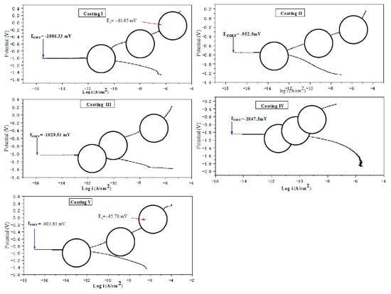 Figure 14 clearly demonstrates that the substrate underwent significant active corrosion across the entire range of the anodic polarization scan, in contrast to the chromium oxide-based coatings, which exhibited superior performance. Although the coatings did not display distinct passivation regions, they showed lower current density (icorr) values. The Ecorr and icorr values of the substrate (−1191.7 mV and 26.7 µA cm−2, respectively) were observed to be more negative and higher, respectively, compared to those of the optimized chromium oxide coatings. This confirmed that the substrate metal was more prone to corrosion than the optimized coatings. The optimized chromium oxide coatings exhibited higher Ecorr and lower icorr values, as illustrated in Figure 14. The Ecorr and icorr values for Coating I, Coating II, Coating III, Coating IV, and Coating V are tabulated in Table 8.