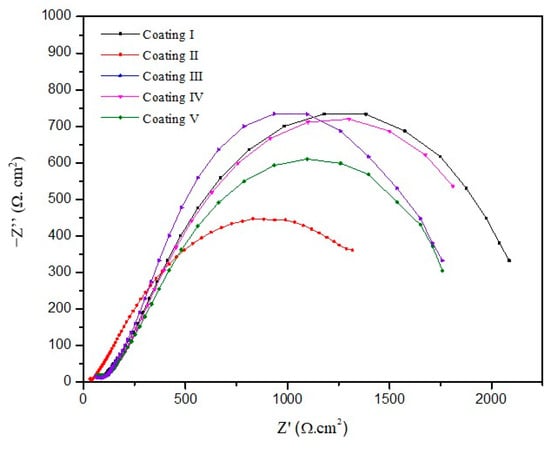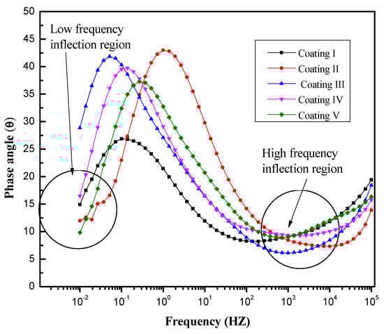In the circuit, solution resistance is Rs, pore resistance is Rp originating from the hindrances to the ionic conduction paths in the coating, Rct is the resistance related to the charge transfer phenomena at the coating/substrate interface, Cc the coating capacitance and Cct is the double layer capacitance. The constant phase element (CPE) used in the circuit in place of pure capacitor was due to the inhomogeneous and porous nature of the coatings. The Nyquist and Bode plots are shown in Figure 15 and Figure 16, respectively. The presence of two consecutive semicircles in the Nyquist plots and the two inflection points on the corresponding Bode phase plots for all the optimized coatings suggests the associated time constants. The low frequency loop could be assigned to the corrosion reaction process while the high-frequency loop indicates the defectiveness in the coatings.