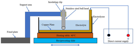 It should be noted that copper substrates are molded through a stretching process. Before the experiment, the L-shaped copper plate was fixed in the electrolytic cell and tightly integrated with it (see Figure 1). The electrolytic cell size is 11.5 × 11.5 × 10 cm. The substrate material was placed in a solution composed of 15 g/L NaOH and 25 g/L Na2CO3 for 15 min to remove surface oil stains, cleaned and blown dry, and then placed in a solution consisting of 160 g/L sulfuric acid and 80 g/L hydrogen peroxide for 30 s activation, washed with water, and dried for later use. The pH value of the solution is 3.5. Electrodeposition experiments were performed using the equipment of Figure 1. The electrodeposition time was 10 min. After electrodeposition, turn off the DC power supply, take out the plated parts, clean the surface with deionized water, and then dry them. After complete drying, store them in a vacuum.