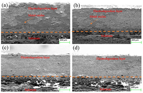 Cross-sectional microstructure of electrodeposited layers: (a) S1 electrodeposited layer; (b) S2 electrodeposited layer; (c) S3 electrodeposited layer; (d) S4 electrodeposited layer.