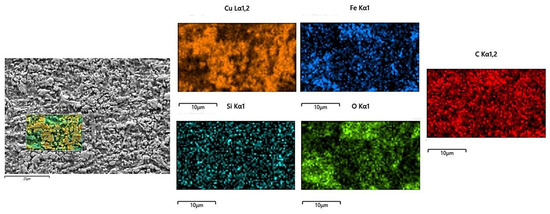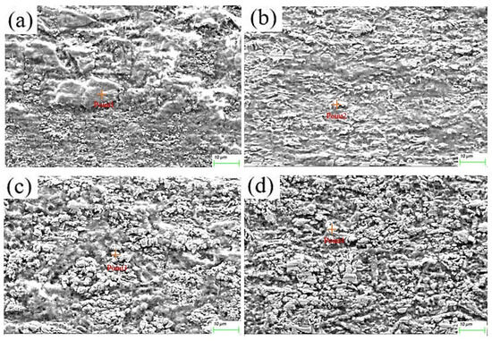 The microstructure evolution of the deposited layer is shown in Figure 8a–d. There are obvious dendrites in the microstructure [21]. The results show the presence of larger-sized iron oxides in S1. Figure 9 and Figure 10 reveal that the S4 deposited layer has finer dendrite morphology in the microstructure. In addition, the iron oxides in S4 are finer than those in S1. This phenomenon indicates that the increase in friction velocity refines the microstructure size of Cu-SiC deposited layer. In addition, there is Fe in the EDS results of the deposition. This phenomenon occurs because stainless steel is used as an anode. During the deposition process, Fe enters the deposition layer and turns into iron oxide. The presence of iron oxide was obvious in S1 and S2 deposited layers (see Figure 6). As the friction speed increased, the larger area of oxides disappeared. The reason for this phenomenon may be that as the friction speed increases, the friction force on the metal oxide with a larger area increases, thereby crushing the iron oxide with a larger area into small fragments. In addition, the elemental content of the microstructure of the deposited layer was tested by EDS, as shown in Table 3. As the friction speed increases, the content of Fe in the deposited layer gradually decreases. This phenomenon occurs because the Fe in the stainless steel rod enters the deposited layer during the friction process. However, friction and extrusion lead to the refinement of the microstructure, making it difficult for Fe elements to aggregate, resulting in a decrease in the Fe content in the deposited layer.