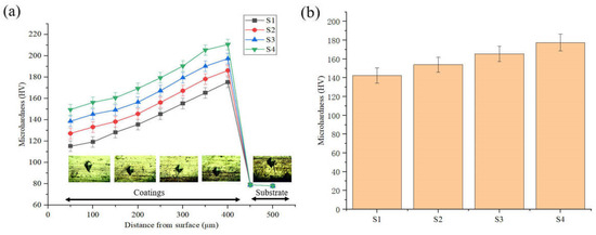 Figure 11 reveals the microhardness of the layers. The average microhardness of the S1–S4 deposited layers are 142.4, 154.0, 165.4, and 177.6 HV, respectively. The microhardness of the deposition is greater than that of the substrate. With the increase of friction speed, the microhardness of the deposition increases. The microhardness of the S4 sample increased by 24.7% compared with the S1 sample. This study found that the closer the deposited layer is to the substrate, the higher the microhardness.
