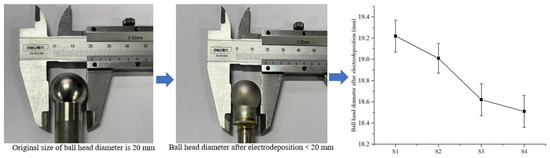 To further investigate the effect of friction on electrodeposition, the change in ball head size before and after electrodeposition was measured, as shown in Figure 12. The anode ball head size was 20 mm in diameter before electrodeposition, and the size after electrodeposition was less than 20 mm. The anode ball head sizes used for samples S1–S4 under friction were 19.22, 19.01, 18.62, 18.51mm. The ball head sizes decreased by 3.9%, 4.9%, 6.9%, and 7.5%, respectively, relative to the initial state. This indicates that as the friction velocity increases, the ball head size decreases. The reason for this phenomenon is related to the increase in current density under friction. The increase in current density accelerates the electrodeposition efficiency, which makes the metal ions in the anode accelerate into the solution and participate in the molding of the electrodeposited layer.