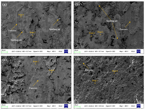 To further reveal the wear mechanism of the electrodeposited layer, the microscopic morphology of the worn samples was tested, as shown in Figure 15. The wear morphology reveals that the electrodeposited layer has different degrees of wear during the friction experiment. There are obvious spalling pits and plowing grooves in the wear morphology of the deposited layer. The spalling pits in the S1 and S2 deposited layers are more obvious. The presence of spalling pits can increase the friction coefficient during the friction process [29]. During the friction process, under the combined action of extrusion and plowing, the SiC particles in the deposited layer participate in the transfer of wear debris to the contact surface of the friction pair and delaminate and fracture under the action of mechanical shear force, and disperse on the contact surface to form a solid lubricating film, which can play a friction-reducing role, thereby reducing the friction coefficient of the composite deposition. The material transfer phenomenon appeared in the wear morphology of the deposited layer. EDS analysis was performed on different parts of the wear morphology (see Table 4). More Si elements were found in the EDS test of the material stacking part. This means that this part has a large distribution of SiC. The higher the SiC content in the composite electrodeposition layer, the more particles will naturally transfer and delaminate during the friction process, which will cause a larger area of solid lubrication film to form on the contact surface of the friction pair, which will effectively reduce friction and reduce the friction coefficient [30]. In addition, the density of the material in the composite electrodeposition layer also affects the friction coefficient. Since the material at the interface of the S4 deposition layer is smoother and denser, its ability to resist plastic deformation is enhanced, which also reduces the friction coefficient. Due to the low content of SiC particles at the interface of the S1 deposition layer, there are very few particles that are delaminated and fractured and transferred to the contact surface of the friction pair under the combined action of extrusion and plowing during the friction process, and the self-lubricating and friction-reducing effect is limited. In addition, the composite deposition formed when the SiC particle content is low has many crystal defects and a poor ability to resist local plastic deformation, which together lead to an increase in the friction coefficient of the S1 sample.