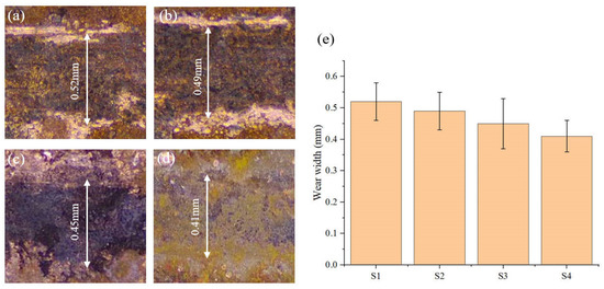 Wear width of electrodeposited layers: (a) S1 electrodeposition layer; (b) S2 electrodeposition layer; (c) S3 electrodeposition layer; (d) S4 electrodeposition layer; (e) Average wear width of the electrodeposition layers.