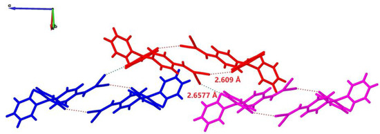 The color of a substance is primarily determined by its molecular crystalline structure, as the molecular structure dictates its light absorption and reflection properties. Therefore, studying the relationship between a substance’s color and its molecular crystalline structure helps us gain a deeper understanding of the substance’s physical and chemical properties. To gain insight into the molecular organization of DPAM, the yellow needle-shaped single crystal A-1, suitable for structural analysis, was obtained by the slow evaporation of an ethanol and water mixed solution of DPAM at room temperature for one week. The orange-red block-shaped single crystal A-2, suitable for structural analysis, was obtained by cooling the hot solution of DPAM in ethanol at room temperature for 6 h. The crystal data, collection procedures, and refinement results of A-1 and A-2 are summarized in Table 1. The A-1 crystal was confirmed as a new crystal form with an orthorhombic crystal system (Figure 2). The results indicate that the A-1 molecular crystal existed in the orthorhombic space group Pbca with a = 11.2205 (6) Å, b = 14.6394 (10) Å, c = 20.9226 (16) Å, and β = 90°. A-2 was a crystal form with a monoclinic crystal system (Figure 3).The results indicate that the A-2 molecular crystal existed in the monoclinic space group P2(1)/c with a = 7.0262 (9) Å, b = 15.9319 (16) Å, c = 16.1075 (19) Å, and β = 95.169 (5)°. The space group of A-2 was one of the most prevalent space groups, first discovered and reported by the Son group in 2009 [33], whereas the crystal structure of A-1 has not been previously reported. A comparison drawn from Table 1 revealed that A-2 had a density of 1.189 g/cm−3, whereas A-1 had a density of 1.242 g/cm−3. A-2 exhibited a lower density than A-1; the crystal structure of the A-2 compound was, therefore, more porous.