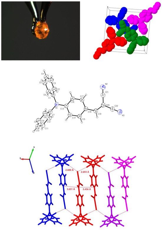 2-(4-(diphenylamino)benzylidene) malononitrile (DPAM) is a kind of triphenylamine derivative, which was first reported by Kuroda in 2003 [31], as shown in Figure 1. In this molecule, the triphenylamine group acts as the electron-donating unit, while the dicyano group serves as the electron-accepting unit, connected by a vinyl bond [32,33]. However, the relationship between the crystal structure, morphology, and mechanochromic phenomenon of DPAM has not been thoroughly investigated, let alone the exploration of new crystal forms. The crystal form diversity of DMAP was obtained in this study. In addition, the characterization, crystal structure, and mechanochromic phenomenon were studied.