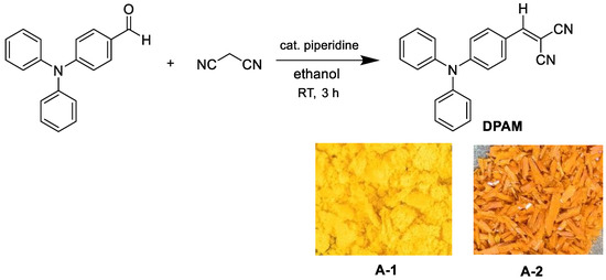 2-(4-diphenylamino-benzylidene)-malononitrile (DPAM) was synthesized by a piperidine-catalyzed Knoevenagel condensation reaction between 4-diphenylaminobenzaldehyde and malononitrile. As shown in Scheme 1, 4 drops of piperidine were added to a solution of 4-(diphenylamino) benzaldehyde (2.74 g; 10 mmol) and malononitrile (1.48 mL; 10 mmol) in ethanol (40 mL). The solution was stirred at room temperature for 3 h, and water (40 mL) was added to the reaction mixture. The DPAM product was precipitated as an orange-red crystal (A-2) and obtained in a 95% yield (3.04 g) by filtering and drying at 110 °C for 3 h. The above DPAM product (1.52 g) was completely dissolved in ethanol (30 mL) under reflux, and water (8 mL) was added. Then, the mixture solution was poured into ice water (100 mL) to precipitate a yellow crystal (A-1), which was obtained in a 90% yield (1.37 g) by filtering and drying at 110 °C for 3 h.