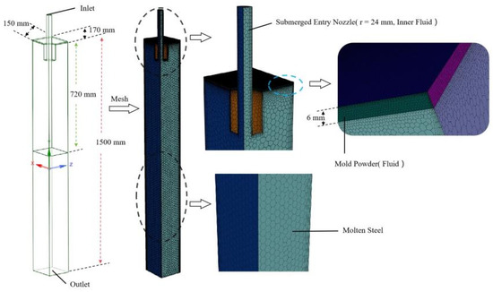 Owing to the bilateral symmetry of the geometric model, a practical 1:1 scaled three-dimensional quarter model was developed, incorporating key features such as the submerged nozzle, molten steel, and slag layers within the crystallizer. The computational domain and mesh division of the geometric model are illustrated in Figure 1. The submerged nozzle employed is a single-hole design, and the effective height of the crystallizer, initially 720 mm, was extended to 1500 mm to facilitate adequate fluid development. The mesh division adopts a hexahedral structure, with the slag layer refined to a 1 mm grid size, resulting in an overall mesh count of approximately 440,000 elements.