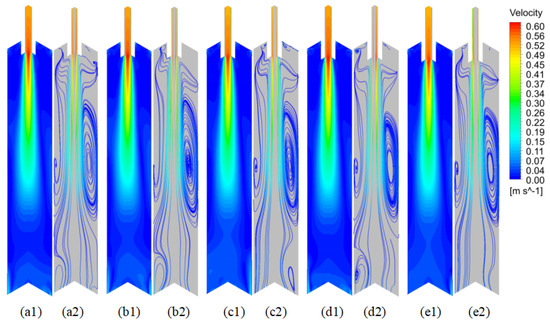 The velocity distribution on the symmetry planes (narrow face and wide face) at varying casting speeds is illustrated in Figure 2. Figure 2(a1,b1,c1,d1,e1) clearly demonstrate that the casting speed significantly influences the flow field. As the casting speed increases, the impact depth of the molten steel flow gradually increases, showing a direct correlation. The impact depths of the molten steel flow at casting speeds of 0.35, 0.45, 0.55, 0.65, and 0.75 m·min−1 are measured at 280 mm, 330 mm, 380 mm, 430 mm, and 480 mm, respectively. For each 0.1 m·min−1 increase in the casting speed, the impact depth increases by 50 mm, indicating a linear relationship. Figure 2(a2,b2,c2,d2,e2) clearly illustrate that the casting speed significantly affects the distribution of molten steel backflow. As the casting speed increases, the backflow region of the molten steel expands, the lower vortex center shrinks, and the vortex speed progressively increases.