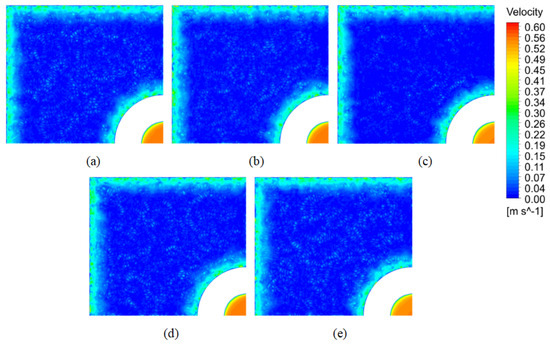 Surface velocity distribution of liquid steel at different casting speeds. (a) 0.35 m·min−1. (b) 0.45 m·min−1. (c) 0.55 m·min−1. (d) 0.65 m·min−1. (e) 0.75 m·min−1.