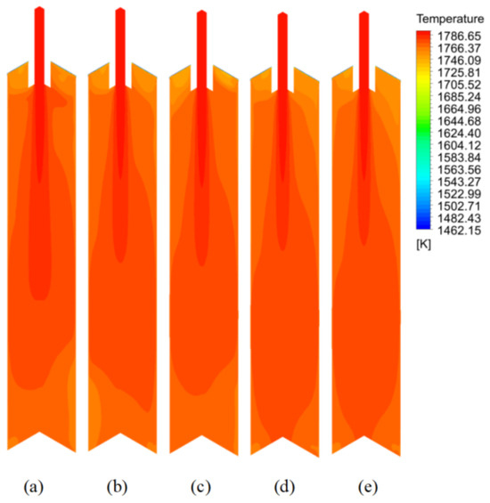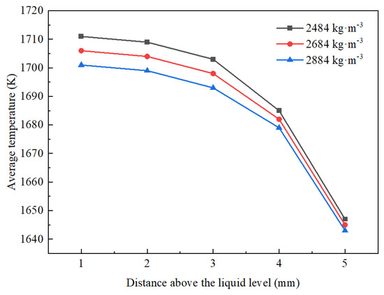 Figure 17 illustrates the temperature distribution of the slag layer within the 1–5 mm range at varying protective slag densities. As depicted in the figure, the temperature distribution of the slag layer across different protective slag densities is relatively similar, with the slag temperature gradually decreasing as the protective slag density increases. As the slag moves further away from the liquid surface, the slag temperature continues to decrease. The temperature stratification within the slag layer remains largely unchanged under different protective slag densities.