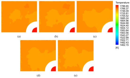 Temperature distribution of liquid steel surface at different casting speeds. (a) 0.35 m·min−1. (b) 0.45 m·min−1. (c) 0.55 m·min−1. (d) 0.65 m·min−1. (e) 0.75 m·min−1.