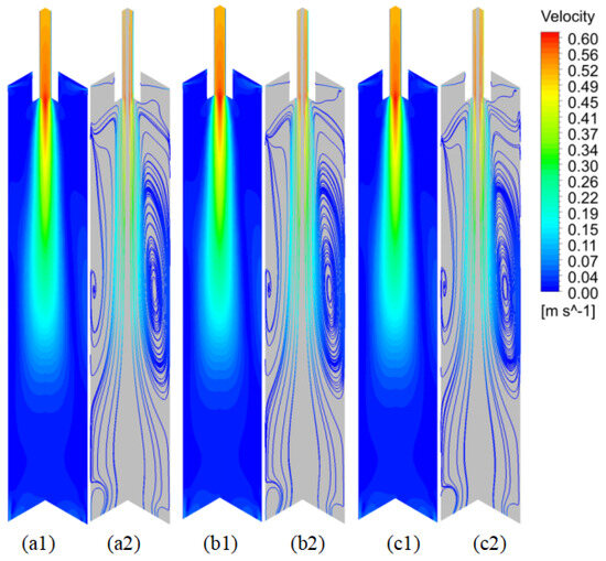 The velocity distribution on the symmetry planes (both narrow and wide faces) at various argon flow rates is presented in Figure 7. As observed from Figure 7(a1,b1,c1), the influence of the argon flow rate on the flow field is minimal. With an increase in the argon flow rate, the impact depth of the molten steel flow gradually diminishes. At argon flow rates of 0.50, 0.75, and 1.00 L·min−1, the impact depths of the molten steel flow are 330 mm, 322 mm, and 320 mm, respectively. As shown in Figure 7(a2,b2,c2), the distribution of the molten steel recirculation zone changes with varying argon flow rates. With an increase in the argon flow rate, the molten steel flow in the upper section of the crystallizer is slightly enhanced due to the upward force exerted by the rising argon bubbles.