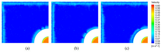 Surface velocity distribution of liquid steel at different argon blowing quantities. (a) 0.50 L·min−1. (b) 0.75 L·min−1. (c) 1.00 L·min−1.