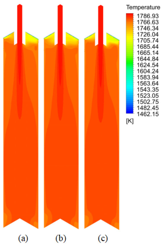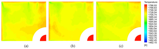 The temperature distribution of the molten steel surface at various argon flow rates is shown in Figure 10. As observed in the figure, the argon flow rate has a notable impact on the surface temperature distribution. The average surface temperatures at argon flow rates of 0.50, 0.75, and 1.00 L·min−1 are 1709.45 K, 1708.33 K, and 1703.74 K, respectively. As the argon flow rate increases, the average surface temperature gradually decreases. At an argon flow rate of 1.00 L·min−1, the surface temperature significantly decreases. The argon bubbles contribute to making the surface temperature distribution of the crystallizer more uniform.