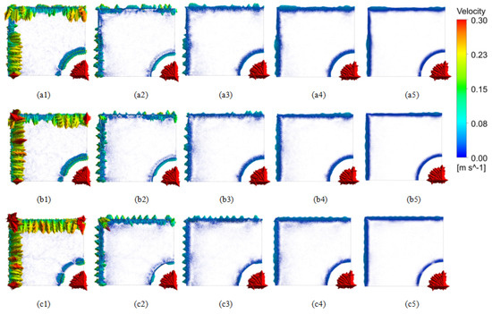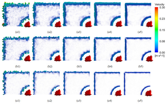 Velocity distribution of liquid slag layer at different density of mold powders (different heights). (a1–a5) Corresponding to 1–5 mm at 2484 kg·m−3. (b1–b5) Corresponding to 1–5 mm at 2684 kg·m−3. (c1–c5) Corresponding to 1–5 mm at 2884 kg·m−3.