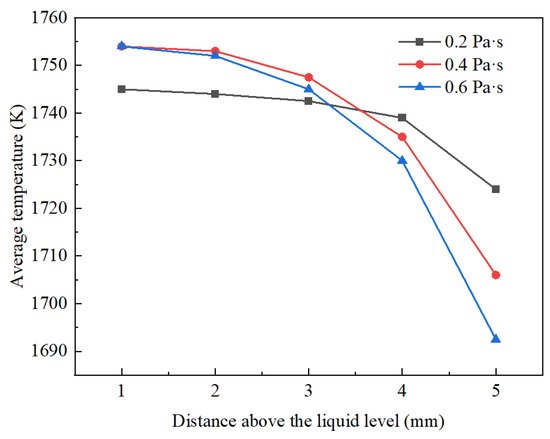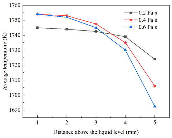 Figure 13 illustrates the temperature distribution within the slag layer (1–5 mm) at varying protective slag viscosities. As shown in the figure, the viscosity of the protective slag significantly influences the temperature distribution within the slag layer. As the height of the slag layer increases from the liquid surface, the temperature gradient within the slag layer varies with different viscosities. The slag layers with viscosities of 0.2 Pa·s, 0.4 Pa·s, and 0.6 Pa·s display distinct temperature stratification at heights of 5 mm, 3 mm, and 1 mm, respectively. With an increase in the viscosity of the protective slag, the temperature distribution at the same height becomes increasingly uneven.
