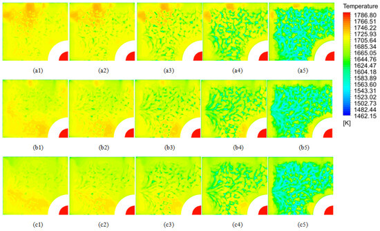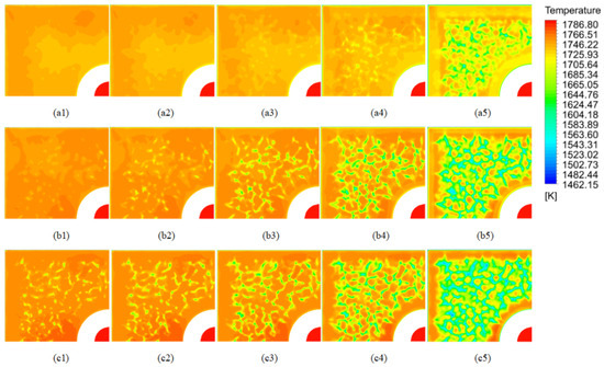 Temperature distribution of liquid slag layer at different density levels of mold powders (different heights). (a1–a5) Corresponding to 1–5 mm at 2484 kg·m−3. (b1–b5) Corresponding to 1–5 mm at 2684 kg·m−3. (c1–c5) Corresponding to 1–5 mm at 2884 kg·m−3.