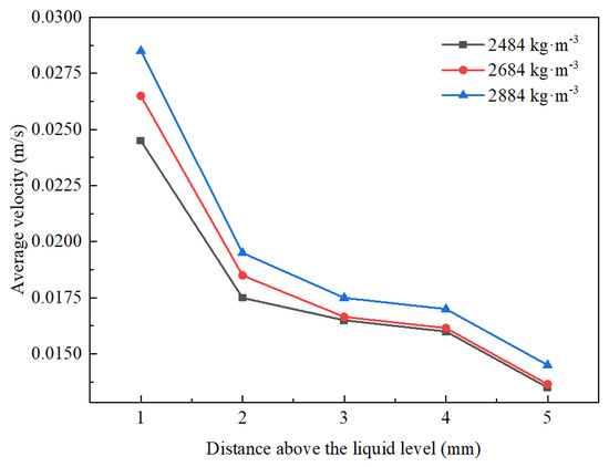 Figure 16 depicts the effect of protective slag density on the velocity of the slag layer. As observed in the figure, the trend of the average velocity of the slag layer remains relatively constant across different densities. With an increase in the density of the protective slag, the flow velocity at the same height gradually rises. As the distance from the liquid surface increases, the slag velocity progressively decreases. In particular, within the first 1 to 2 mm above the liquid surface, the velocity decreases more rapidly, while in the range of 2 to 5 mm above the liquid surface, the velocity decreases at a slower rate.