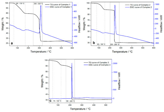 | Complex 1 | 60–120 °C | 120–180 °C | 260–320 °C | at 600 °C |
