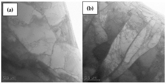 The presence of fine TiC and ZrC carbide particles (not resolved in the optical microstructures) and the possible presence of Mo2C particles along the grain boundaries could be attributed to the finer grain size, which in turn increased the hardness. Figure 2a,b display the high-resolution microstructures of the Mo and TZM samples obtained using transmission electron microscopy. Cellular dislocations entangled in the form of subgrain structures and cell walls were observed in both samples. The Mo sample exhibited an almost equiaxed subgrain structure, while the TZM sample displayed elongated subgrain structures. The dislocation density appeared higher in the TZM than in the Mo sample. The darkly shaded particle-like structure on the left side of Figure 2b could be a carbide particle; however, neither elemental analysis nor selected area electron diffraction data were obtained to support this.