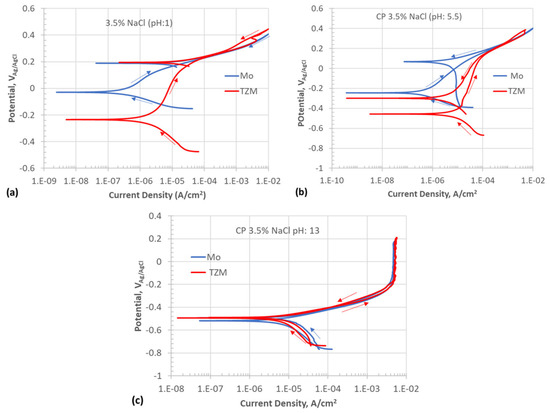 Cyclic polarization plots of the Mo and TZM samples in 3.5% NaCl solutions at different pH conditions at room temperature: (a) 3.5% NaCl + 0.1 M HCl (pH: 1), (b) 3.5% NaCl (pH: 5.5), and (c) 3.5% NaCl + 0.1 NaOH (pH: 13).