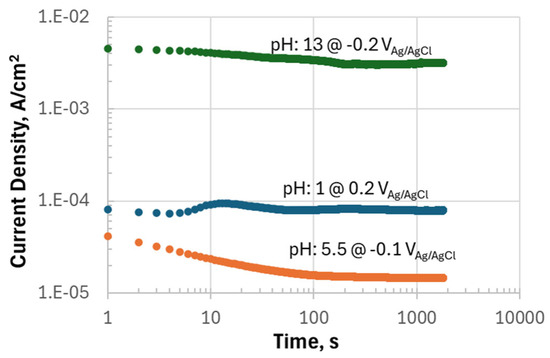 Current vs. time plots of TZM samples in 3.5% NaCl solutions at different pH conditions under potentiostatic conditions.